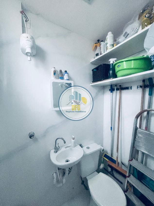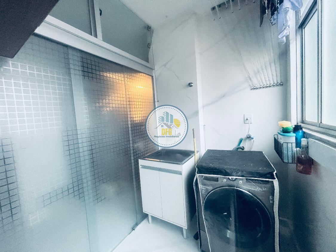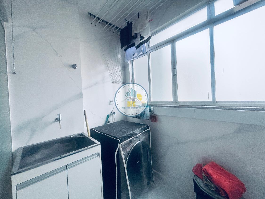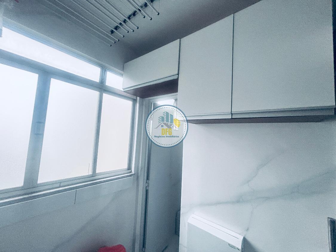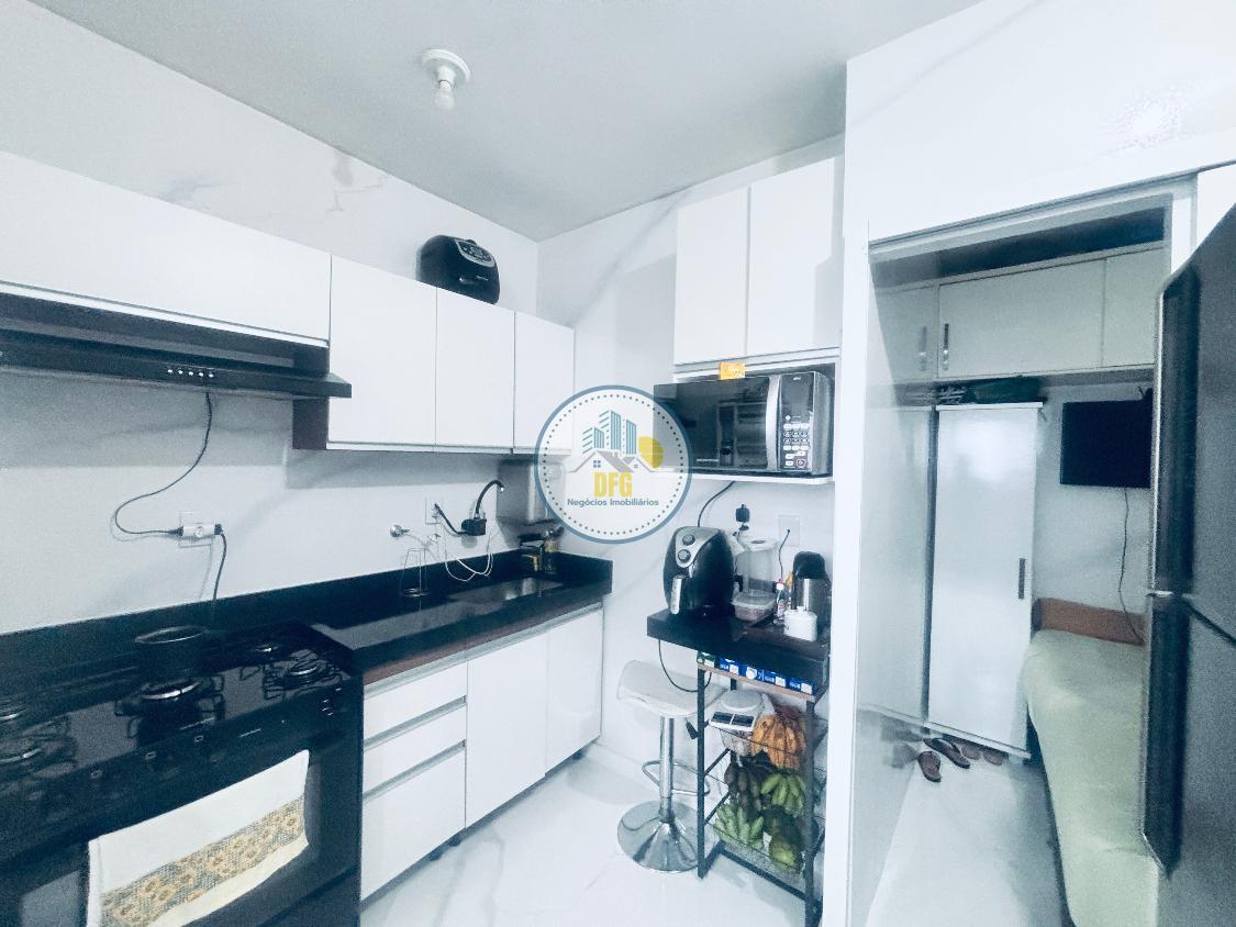 A cozinha é funcional, equipada com armários planejados e bancada em granito. O imóvel conta com piso em porcelanato na área social, laminado de madeira na área íntima, área de serviços independente com despensa e banho social.